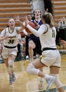Photo courtesy of Mark Evans Warren senior Gracie Ruhlman goes up for a shot over Blackhawk’s Piper Romigh (30) and Alena Fusetti (11).