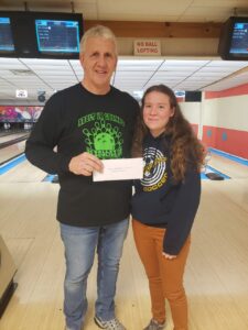 The second annual Robert Johnson Memorial Scholarship Tournament was held at Valley Bowling Center on Sunday. Scholarships were awarded to the top three bowlers in each division — $425 for first place, $225 for second place and $150 for third place for a total of $4,000. From the left are the division winners: Payton Frank (third), Ella Card (second) and Madalynn Perry (first), Division A Girls; Casie Anderson (third), Elley Eastman (second) and Abby Allen (first), Division B Girls; Dominic Sporveri (third), Steven Rex (first) and Konnor Eck (second), Division A Boys; Max Papalia (third), James Crawford (second) and Carsyn Branstrom (first), Division B Boys; and Michael Tremblay (second), Liam Farmery (third) and Eric Steuart (first), Division C Boys. In photo at far right, Elley Eastman receives the Robert Johnson Memorial Scholarship from Dale Johnson of Valley Bowling Center. Eastman is graduating from Eisenhower High School this year and is heading to PennWest Edinboro to study actuarial science in the fall.