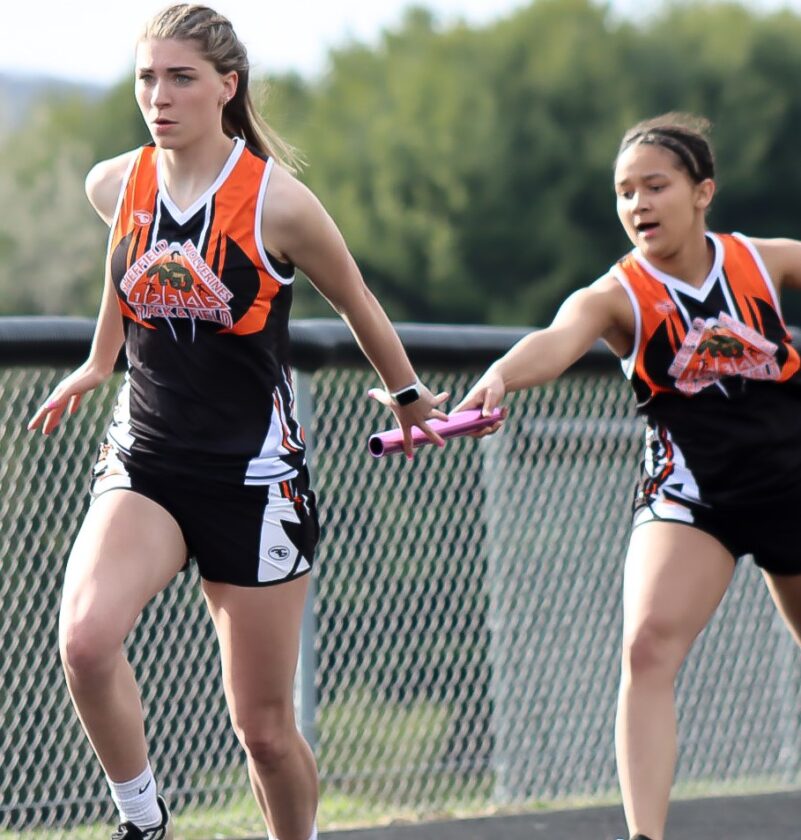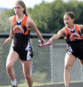 Times Observer Photo by Cody Elms Kassidy Orinko takes the handoff from Bryana Butler Tuesday during the 400-meter relay.