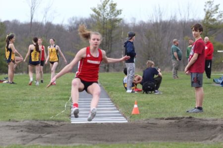 Times Observer Photo by Steve Younger Eagles’ Riley Robinault takes off in the long jump.