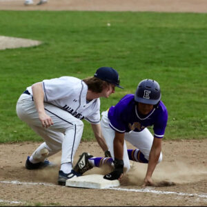 - Warren first baseman Anthony Errett holds the tag on an Erie High runner. Photo courtesy of Mark Evans