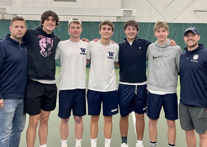 Photo submitted to Times Observer Warren senior Logan Fincher will play for a District 10 2A singles championship at 3 p.m. Monday at Westwood Racquet Club in Erie. With Fincher (middle) are, from left, coach Travis Myler, Hugh Harrison, Owen Strandburg, Mark Lynds, Adam Strandburg, and coach Thomas Pellegrino.
