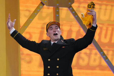 - Eisenhower shortstop Kael Hunt goes airborne to make a throw to first base during Thursday’s Region 3 baseball game against Iroquois in Russell. Times Observer Photo by Steve Younger