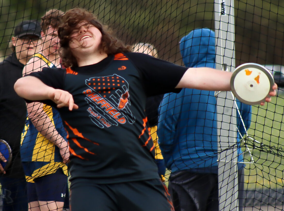 - Sheffield senior Conner Winslow launches a discus in his final home meet atop Wolverine Mountain against cross-county rival Eisenhower on Thursday afternoon. Times Observer Photo by Cody Elms
