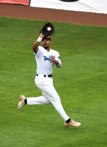 Times Observer photo by Scott Kindberg Jamestown right-fielder Drew Garth makes a catch during Wednesday’s PGCBL at Diethrick Park.