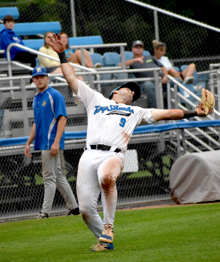 - Jamestown Tarp Skunks third baseman Aidan Wallace catches a foul pop-up during Saturday’s PGCBL West Division game against the Niagara Power at Diethrick Park in Jamestown, N.Y.