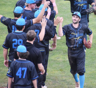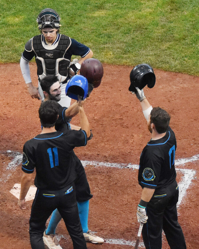 - Jamestown celebrates a Kieran Gagnon (22) home run in the second game of the doubleheader. Times Observer Photo by Scott Kindberg