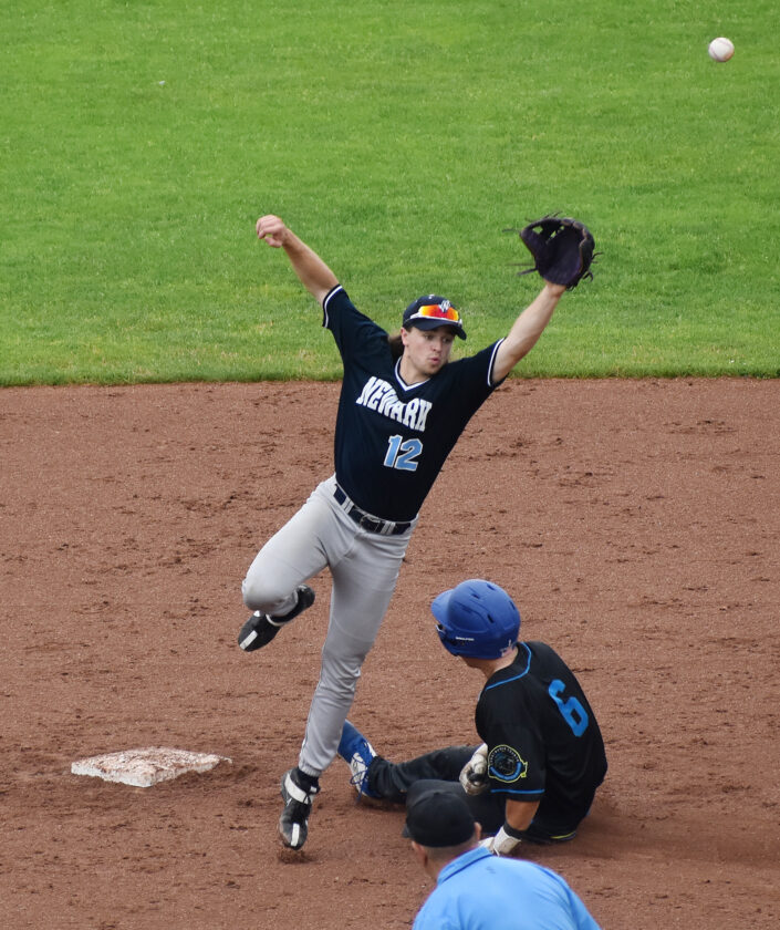 - Jamestown’s Alex Ahlstrom steals second base during the first game of a doubleheader against Newark on Wednesday. Times Observer Photo by Scott Kindberg
