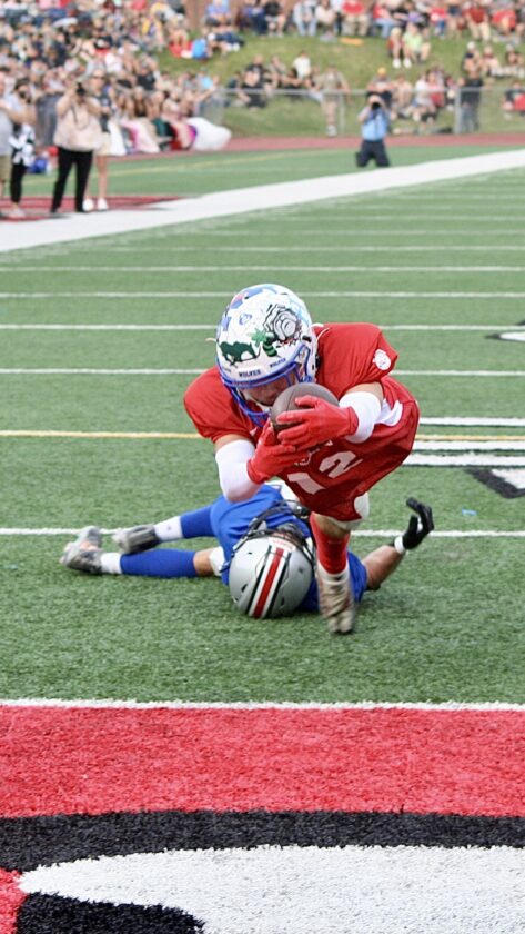 Times Observer Photo by Jon Sitler Kane’s Ricky Zampogna dives over the goal line for a second-quarter touchdown in Pennsylvania’s 34-27 Big 30 Charities Classic win over New York on Saturday at Parkway Field in Bradford.