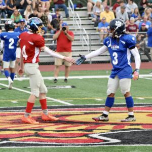 Times Observer Photo by Jon Sitler From left, Otto-Eldred’s Blaze Maholic wishes Franklinville-Ellicottville’s Brad John luck prior to Pennsylvania’s 34-27 Big 30 Charities Classic win over New York on Saturday at Parkway Field in Bradford.