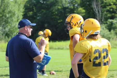 Knights head coach Jim Penley sends in a play with Kris Bunk and Derek Childs.