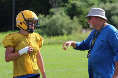 - Times Observer photo by Steve Younger Knights head coach Jim Penley sends in a play with Kris Bunk and Derek Childs.