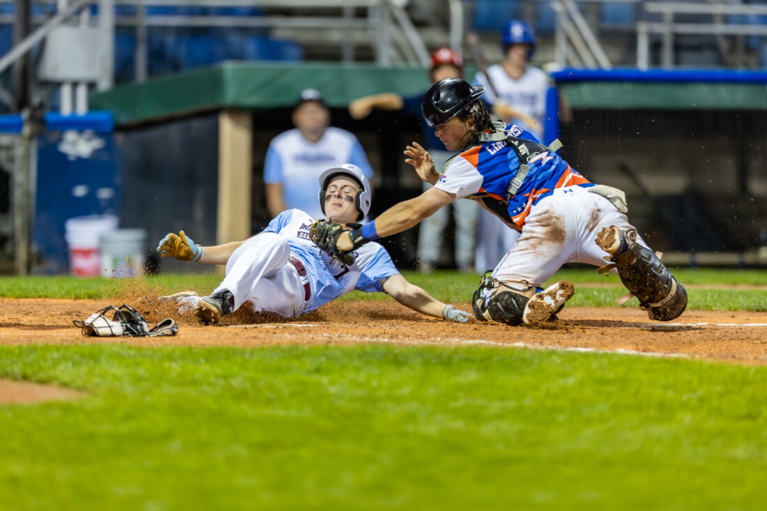 Times Observer photo by Tim Frank Jamestown Krusaders catcher Branston Lindquist tags out Broomall Newtown, Pennsylvania's Jackson Burger to complete an inning-ending double play during Game 4 of the Babe Ruth 13-15 World Series on Saturday at Diethrick Park in Jamestown, N.Y.