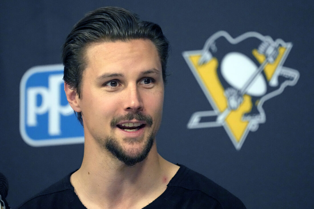 Newly acquired Pittsburgh Penguins defenseman Erik Karlsson holds his first meeting with reporters in Pittsburgh on Wednesday since being traded from the San Jose Sharks. AP photo