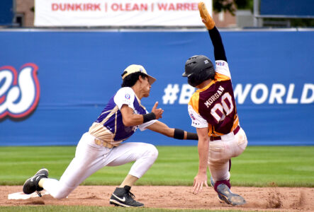 - Portland, Oregon’s Brave Johnson tags out Opp, Alabama’s Matthew Morgan attempting to steal during Game 21 of the Babe Ruth 13-15 World Series on Thursday at Diethrick Park in Jamestown, N.Y. Times Observer photo by Matt Spielman