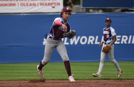Times Observer photo by Matt Spielman Beekman, New York's Tristan Rivera throws to first base during Game 17 of the Babe Ruth 13-15 World Series against Greenville, North Carolina on Wednesday at Diethrick Park in Jamestown, N.Y.