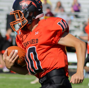 - Times Observer photo by Cody Elms Sheffield quarterback Colby Barr runs up the visitor’s sideline during a 46-12 loss Saturday to Elk County Catholic.