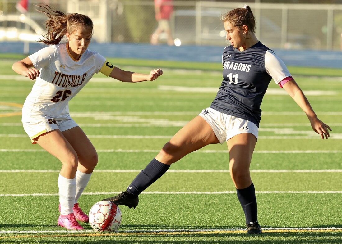 Photo courtesy of Mark Evans Warren senior Eliza Brook takes the ball from a Titusville player on Thursday in a Dragons’ win at War Memorial Field.