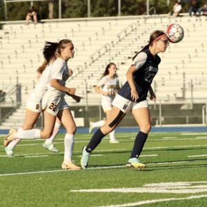 Photo courtesy of Mark Evans Warren junior Lucy Bigelow heads the ball toward the net.