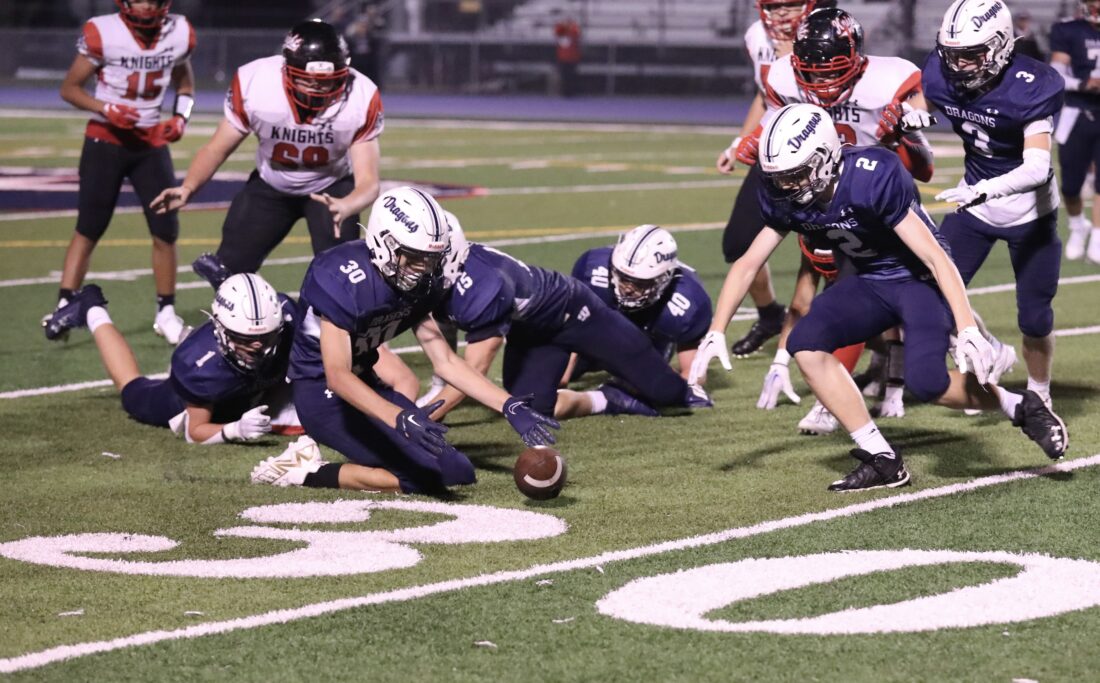 - Photo courtesy of Mark Evans Warren’s Pat Ross (30) goes after a fumble on Friday in Franklin’s 35-0 win on the Dragons’ homecoming game at War Memorial Field.