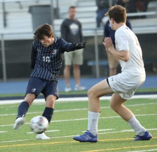 - Photo courtesy of Mark Evans Warren’s Finn Ordiway shoots to score in the Dragons’ 4-0 Region 4 win over Saegertown on Wednesday at War Memorial Field.