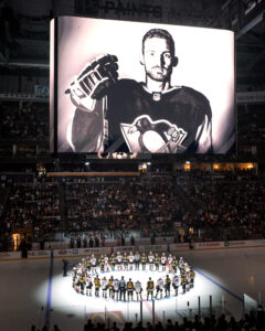 A black and white photo of Johnson was displayed on the scoreboard and a white spotlight on center ice. The video tribute included Johnson’s debut in Nashville and his first NHL goal in Minnesota. Instead of a moment of silence, the Penguins asked to give one final cheer for Johnson. Fans applauded and players tapped their sticks around the center circle.
