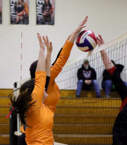- Times Observer photo by Cody Elms Sheffield’s Kassidy Orinko, back, and Madi Connolly, front, tag-team in blocking a Youngsville return Monday evening inside Ralph J. Santo Gymnasium.