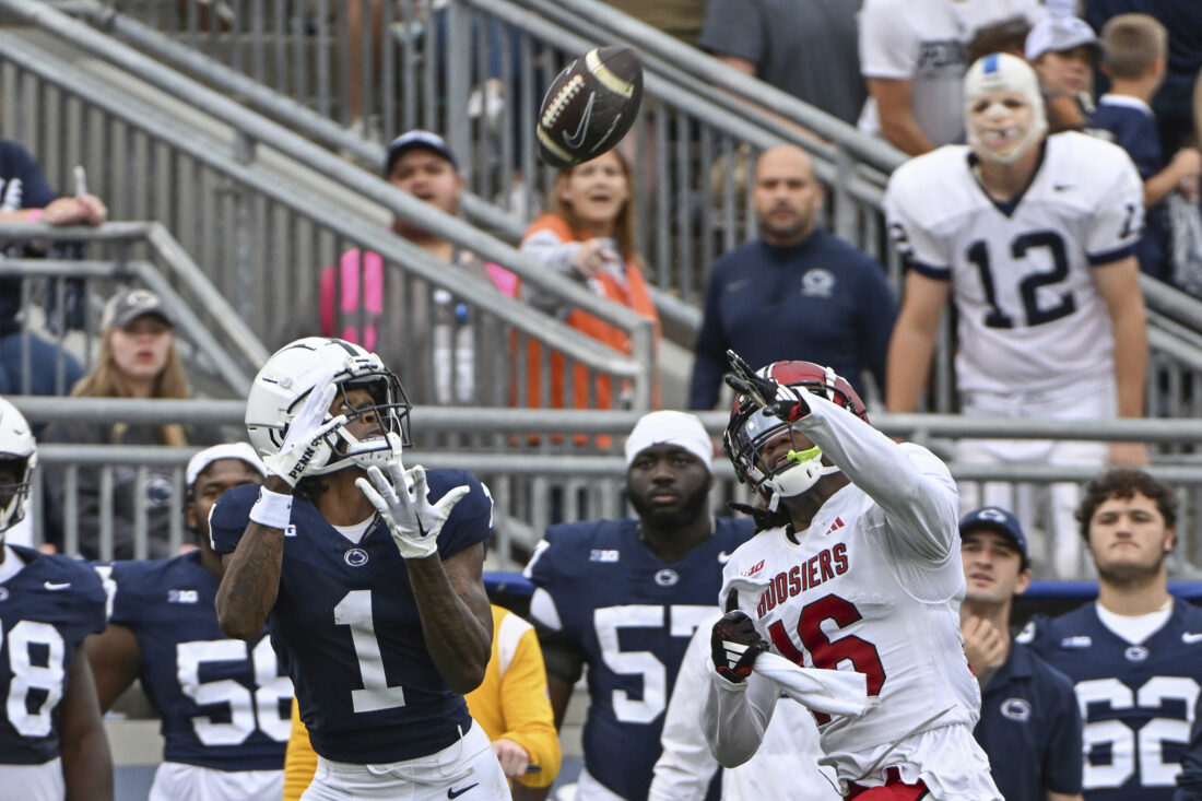 AP photo Penn State wide receiver KeAndre Lambert-Smith (1) catches a touchdown pass in front of Indiana defensive back Jordan Grier (16) during the second half last Saturday in State College.