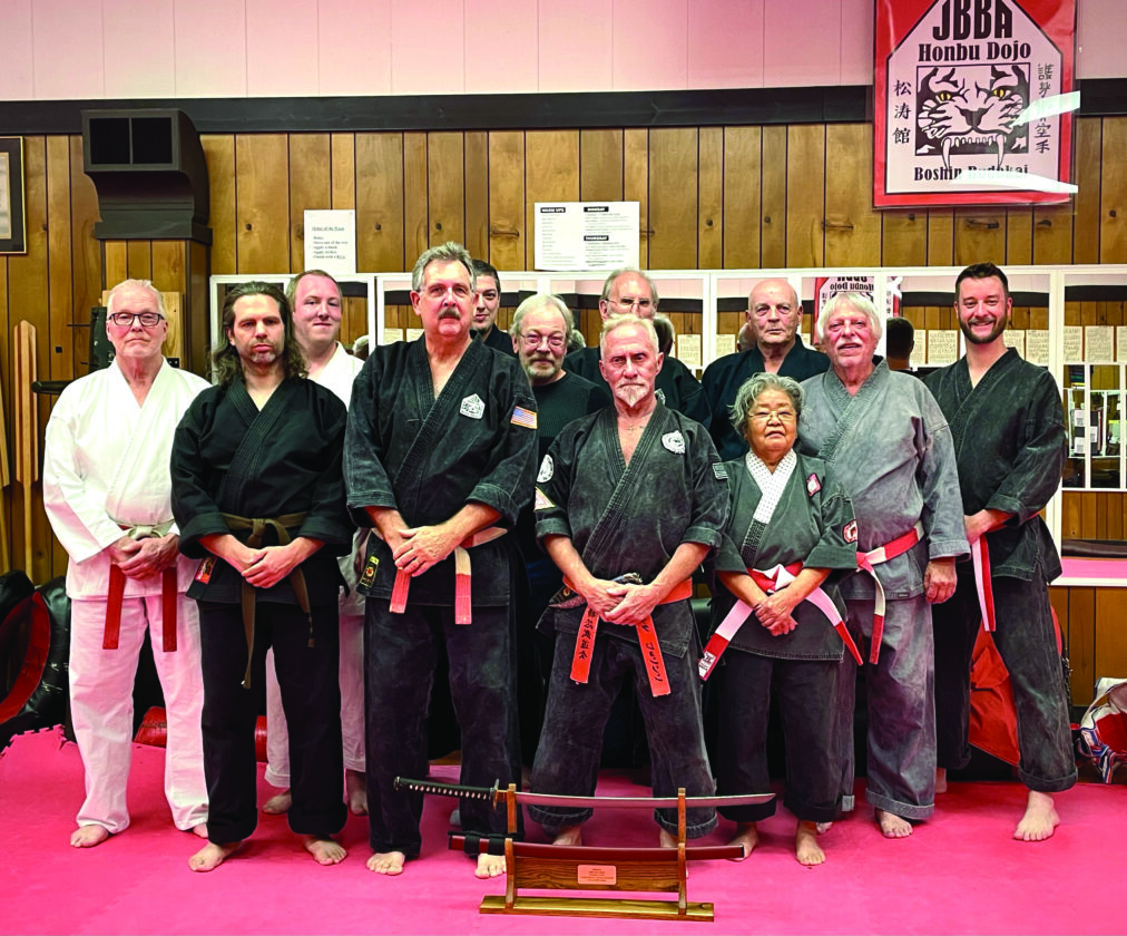 In a surprise ceremony, the Karate Masters of Johnson’s Black Belt Academy, presented Master Johnson with a commemorative sword in honor and recognition of his promotion to 10th Dan, in the Art of Shotokan Karate. The sword holds special symbolism; the Saya (scabbard) is red, reflecting Master Johnson’s belt and rank and representing valor, honor and courage; the blade is Damascus steel, reflecting the strength of his character, (body, mind and spirit) and the tempering of his martial arts skills through his years of training. In addition, he was presented with a complimentary sword stand, with engraved plaque, memorializing the event. Pictured with Master Johnson, from left to right, are Kyoshi Bob Bruyer, 8th Dan; Adam Yurchisin, Sankyu; Renshi Erik Krantz, 4th Dan; Kyoshi Don Nelson, 8th Dan; Renshi Bruce Tuller, 4th Dan; Kyoshi Craig Ames, 8th Dan; Master Johnson, 10th Dan; Kyoshi Roger Shattuck, 8th Dan; Kyoshi Yoshiko Wood, 8th Dan; Kyoshi Randy Dickey, 8th Dan; Kyoshi Mark Williams, 8th Dan; and Renshi Jason Loree, 4th Dan.