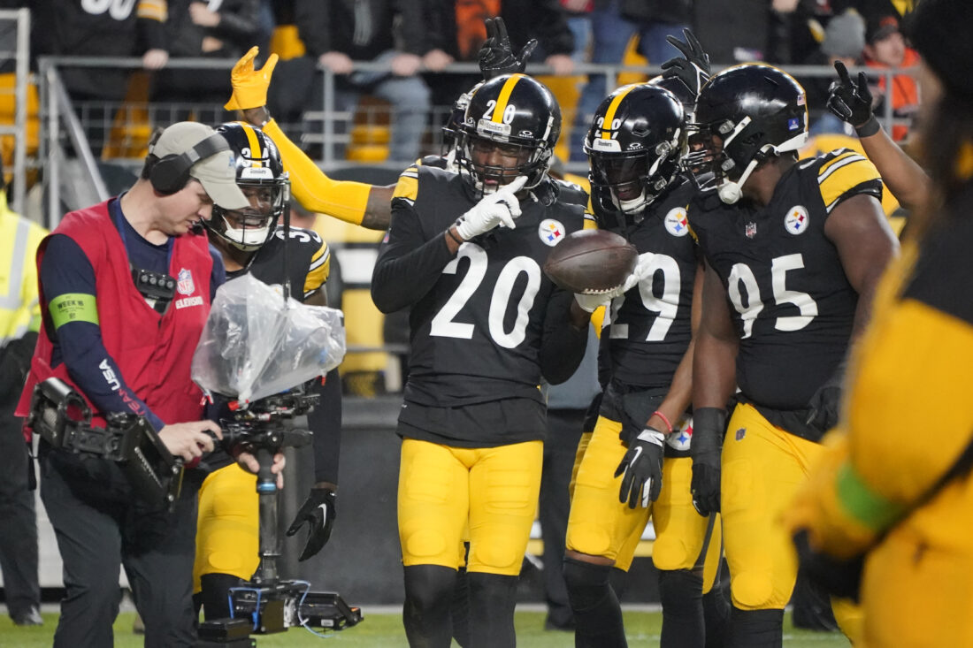 Pittsburgh Steelers cornerback Patrick Peterson (20) celebrates his interception in the end zone with teammates Levi Wallace (29) and Keeanu Benton (95) during the first half against the Cincinnati Bengals. AP Photo