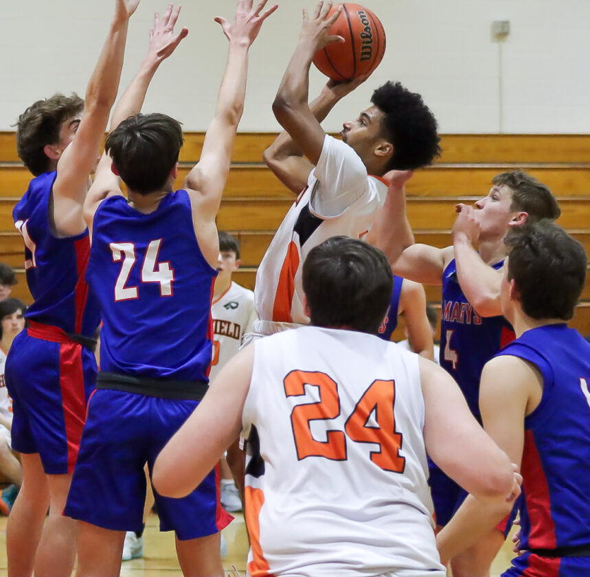 - Times Observer Photo by Cody Elms The St. Marys Flying Dutchmen swarm to Sheffield’s Leihden Wotorson as he takes a shot in a 69-51 loss.