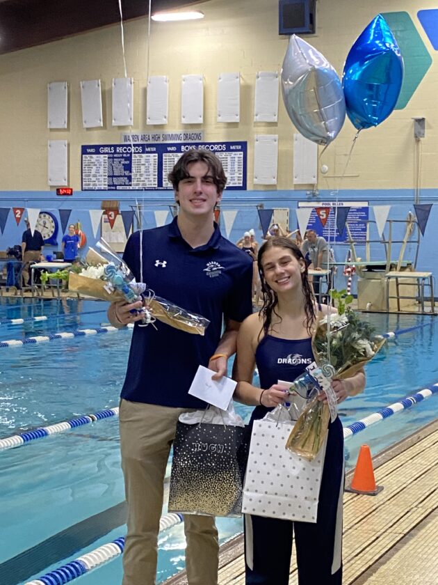 Photo by Mark Evans Warren seniors Hugh Harrison and Eliza Brook were honored during Senior Night activities at the Dragons’ swim meet against Mercyhurst Prep at the Warren YMCA.