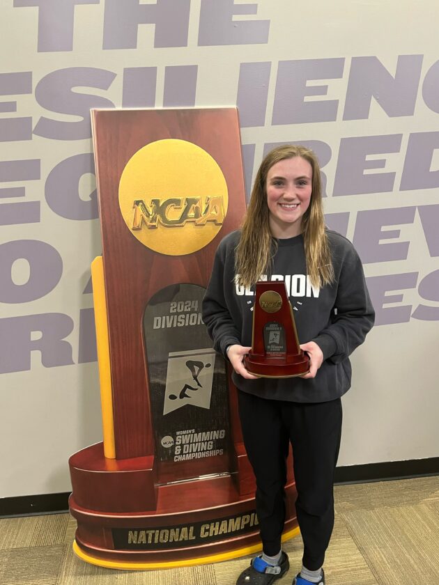 In fact, four Golden Eagles finished among the top eight 3-meter divers in the nation with junior Alexa Gonczi crowned national champion with a six-dive total of 505 points. Clarion sophomore Luna Castellanos was third with 471.75 points, Madigan fifth with 418.5 and freshman teammate Colleen Hudson sixth at 415.75.