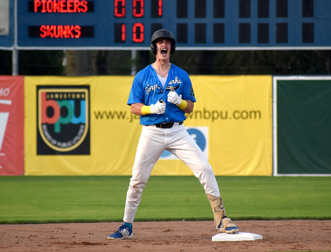 Times Observer Photo by Matt Spielman Jamestown’s DJ Stoianovich celebrates his two-run double during Wednesday’s PGCBL game against Elmira (N.Y.) at Diethrick Park in Jamestown, N.Y.
