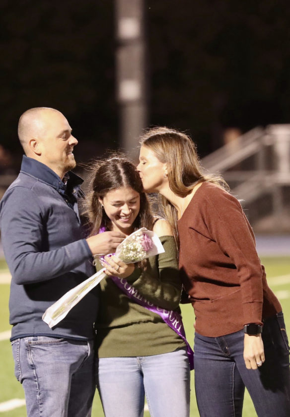senior Noel Alexander, with parents James and Heather, was named Warren Area High School homecoming queen at halftime. Times Observer Photo by Mark Evans