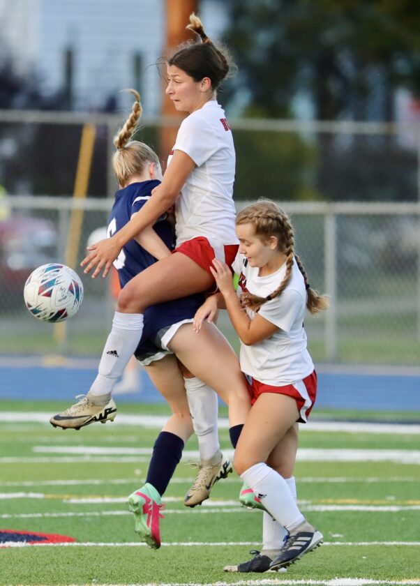 Photo by Mark Evans Warren defender Lilly Stanley, left, collides with two Meadville players in the Dragons’ 11-0 Region 6 win Thursday at War Memorial Field.