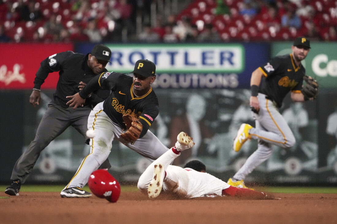 AP photo St. Louis Cardinal Victor Scott II is caught stealing second as Pittsburgh Pirates second baseman Liover Peguero waits for the throw during the seventh inning of a baseball game Tuesday in St. Louis.