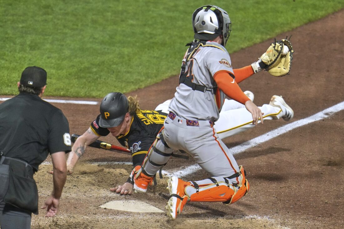 - AP photo Pittsburgh Pirates’ Jack Suwinski, center, scores the game-winning run ahead of the tag by San Francisco Giants catcher Patrick Bailey, right, on a fielder’s choice by Isiah Kiner-Falefa off pitcher Randy Rodriguez with umpire Ryan Addison, left, making the call during the ninth inning of Monday’s game in Pittsburgh.