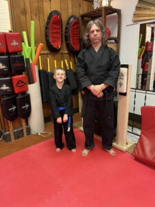 - JR Thomas, left, was recently promoted to blue belt at Johnson’s Black Belt Academy. Thomas is pictured with Sensei Adam Yorchisin, testing instructor.