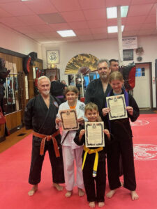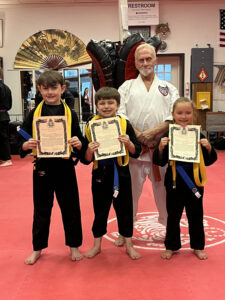 - Pictured, from left, are: Stephen Haight, Lincoln Haight and Cora Ingersoll, who were all promoted to blue belts by Rick Johnson, 10th Dan and chief instructor at Johnson’s Black Belt Academy, pictured in back.