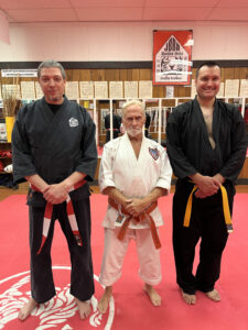Pictured, from left, are: Shihan Bruce Tuller, testing board; Rick Johnson, 10th Dan and chief instructor at Johnson’s Black Belt Academy; and Jacob Gambino, recently promoted to yellow belt.