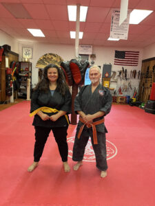 Sue James of the All Women’s Martial Arts Program was recently promoted to yellow belt by Rick Johnson, 10th Dan and chief instructor at Johnson’s Black Belt Academy.
