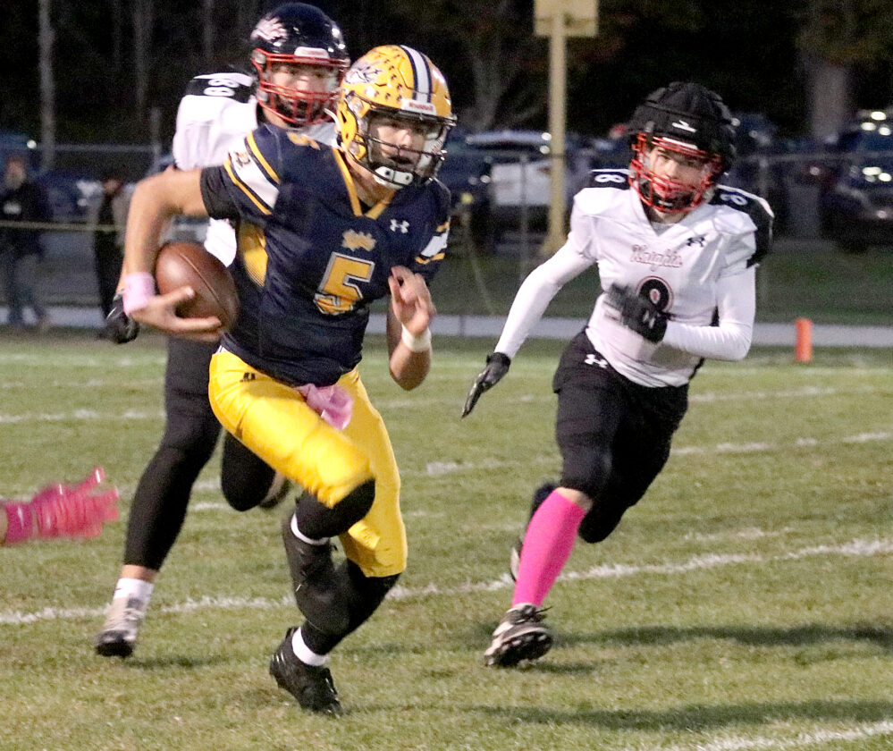 RUSSELL — Eisenhower quarterback and free safety Caleb Jakubczak made sure that his team would not have a letdown after last week, scoring two rushing touchdowns and intercepting a pair of passes — returning on 63 yards for a score — as the Knights beat Franklin 42-13 for a homecoming victory Friday.