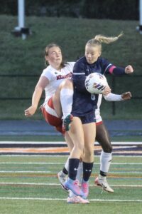 - Warren’s Lilly Stanley wins the ball under pressure from a Meadville attacker Wednesday in Erie. Photo courtesy of Mark Evans