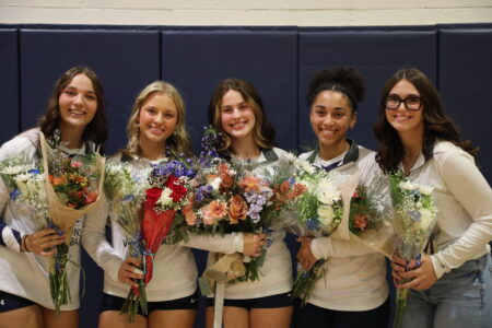 The Warren volleyball team celebrated Senior Night on Thursday. From the left are Lilly Newton, Lauren Fajbik, Madelyn Nosel, Peyton Wotorson and statistician Zoe Rodgers. Photo courtesy of Mark Evans