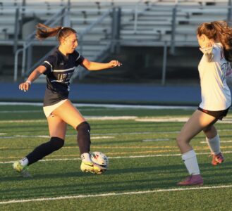 - Photo courtesy of Mark Evans Warren’s Meea Irwin dribbles up the field during Thursday’s soccer game at War Memorial Field.