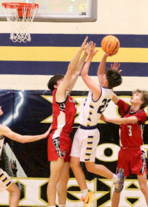 - Eisenhower’s Kymani Vine puts up a shot in between three Lakeview defenders during Friday’s boys basketball game in Russell. Times Observer photo by Steve Younger