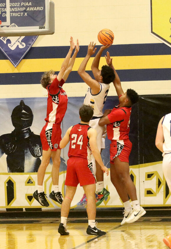 - Eisenhower’s Liam Hanson shoots in between Lakeview defenders Friday. Times Observer photo by Steve Younger