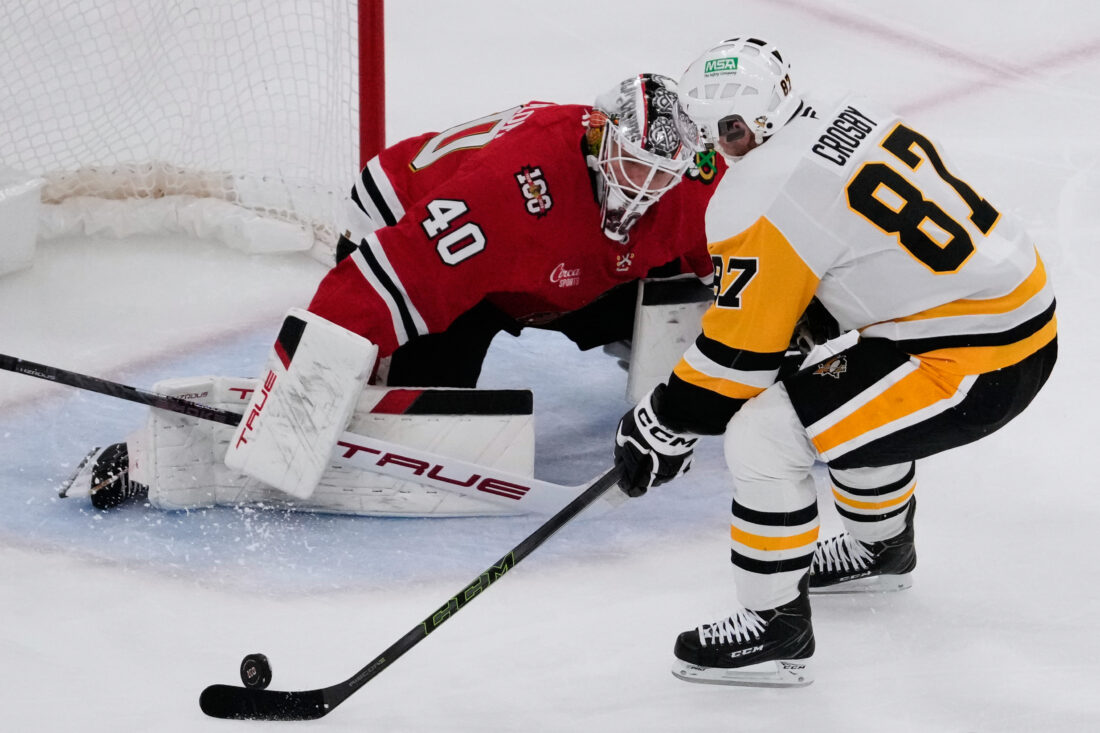 Pittsburgh Penguins center Sidney Crosby, right, shoots against Chicago Blackhawks goaltender Arvid Soderblom, left, during the second period of Sunday’s game in Chicago. AP Photo