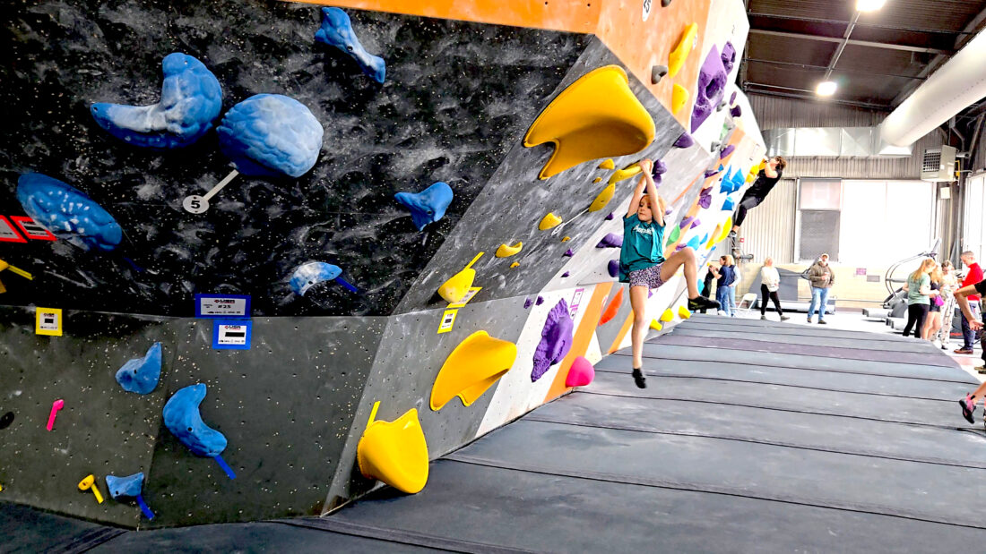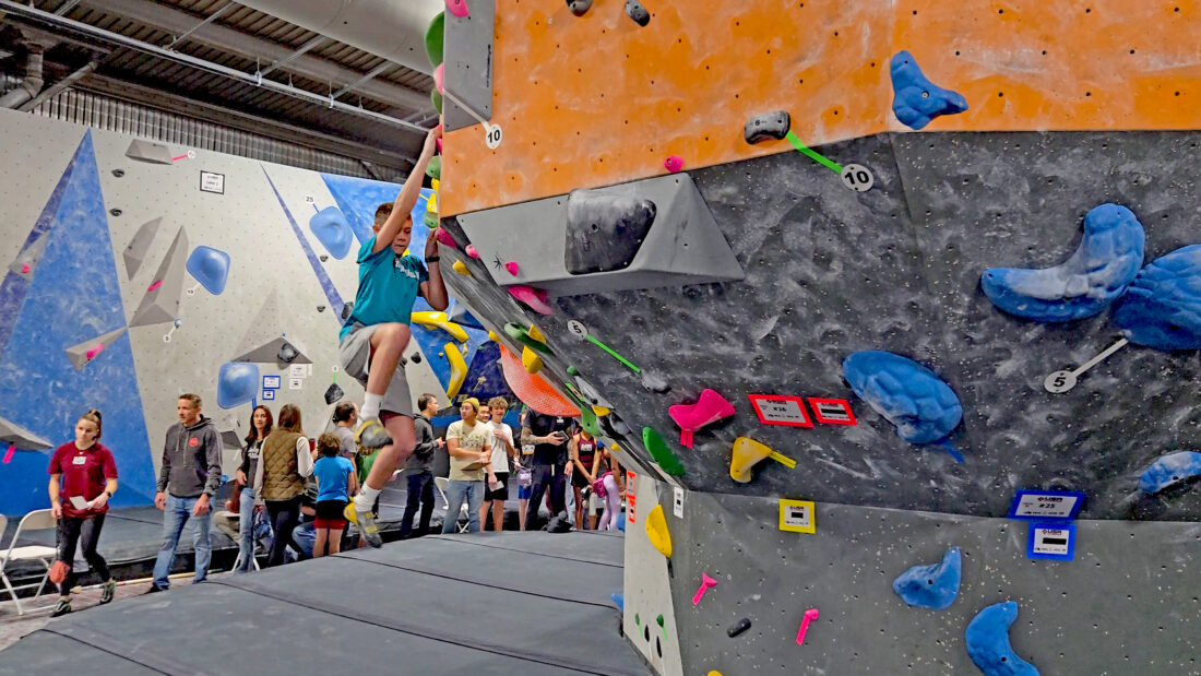 Regardless of circumstances, Goat Fort’s climbers were focused and brought their best. The older, more experienced athletes: White, Muntz and Grant Criswell, were as reliable as ever — finishing sixth, 11th and 11th, respectively. Goat Fort’s U13 girls (Nina Harrington, Elodie Criswell and Eloise Harrington) dominated — all three finished in the top 10. Heath, in her first season, was able to score on six of seven boulders. And Miller, in his first event of the season, provided one of the highlights of the day with a buzzer beater — topping one final boulder as time expired.